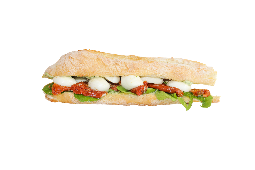 SANDUICHE DE BAGUETE MULTIGRÃOS, TOMATE SECO, RÚCULA E MUSSARELA DE BUFALA